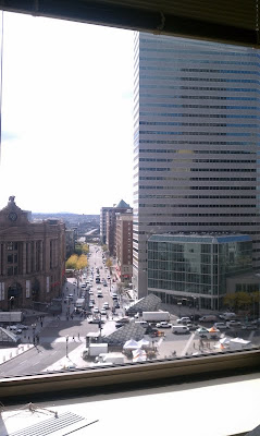 Hi bloggies! So as you all know, yesterday was my first day at a new job (YAY!) and I can't really go into too much detail of course, but suffice it to say it's where I have been trying to get for years now, I get to travel a lot, and so far my coworkers are great! My boss and a coworker took me out yesterday to Elephant Castle in Boston, but since it was my first day and all, I felt a little weird about taking pictures, but rest assured, I will go back and review it officially for you guys. I'm actually excited about the prospect of reviewing all the restaurants in the area for you guys. Here is the view from my office kitchen: